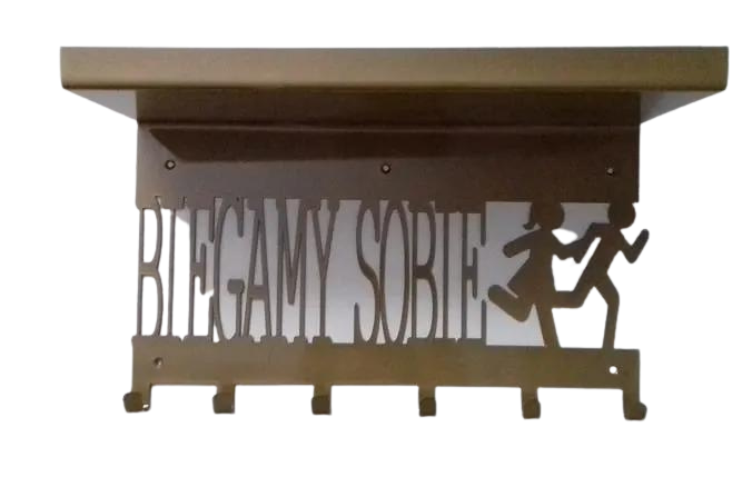 Wieszak z półką dla biegaczy - dla pary - z napisem Biegamy Sobie oraz postaciami (ikonkami) przedstawiającymi biegnącą parę.